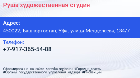 Руша, художественная студия по адресу 450022, Башкортостан, Уфа, улица Менделеева, 134/7 в дальнейшем Организация, размещена в следующих категориях: