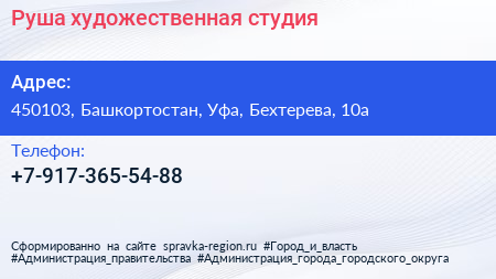 Руша, художественная студия по адресу 450103, Башкортостан, Уфа, Бехтерева, 10а в дальнейшем Организация, размещена в следующих категориях: