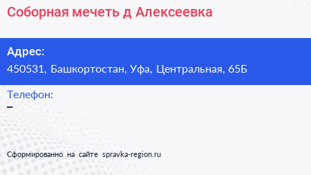Соборная мечеть, д. Алексеевка по адресу 450531, Башкортостан, Уфа, Центральная, 65Б в дальнейшем Организация, размещена в следующих категориях: