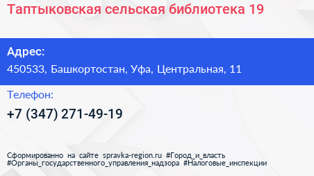 Таптыковская сельская библиотека №19 по адресу 450533, Башкортостан, Уфа, Центральная, 11 в дальнейшем Организация, размещена в следующих категориях: