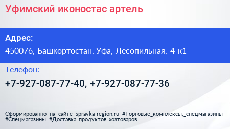 Уфимский иконостас, артель по адресу 450076, Башкортостан, Уфа, Лесопильная, 4 к1 в дальнейшем Организация, размещена в следующих категориях: