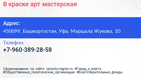 В краске, арт-мастерская по адресу 450099, Башкортостан, Уфа, Маршала Жукова, 10 в дальнейшем Организация, размещена в следующих категориях: