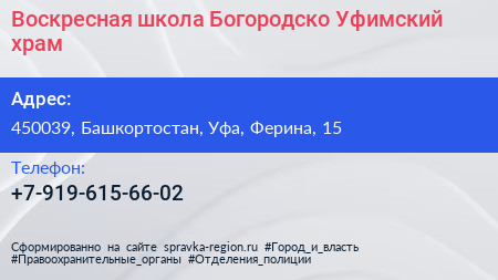 Воскресная школа, Богородско-Уфимский храм по адресу 450039, Башкортостан, Уфа, Ферина, 15 в дальнейшем Организация, размещена в следующих категориях: