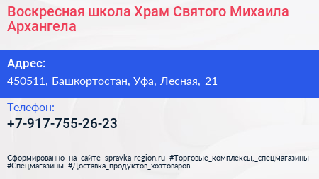 Воскресная школа, Храм Святого Михаила Архангела по адресу 450511, Башкортостан, Уфа, Лесная, 21 в дальнейшем Организация, размещена в следующих категориях: