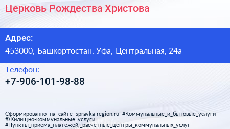 Церковь Рождества Христова по адресу 453000, Башкортостан, Уфа, Центральная, 24а в дальнейшем Организация, размещена в следующих категориях: