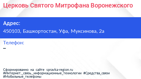 Церковь Святого Митрофана Воронежского по адресу 450103, Башкортостан, Уфа, Муксинова, 2а в дальнейшем Организация, размещена в следующих категориях: