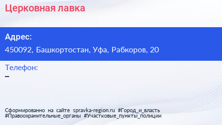 Церковная лавка по адресу 450092, Башкортостан, Уфа, Рабкоров, 20 в дальнейшем Организация, размещена в следующих категориях: