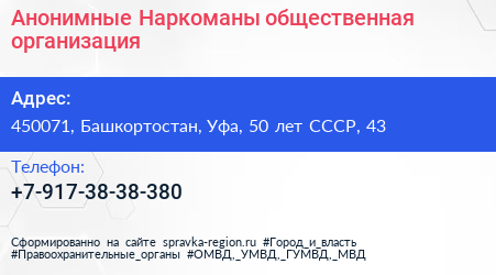 Анонимные Наркоманы, общественная организация по адресу 450071, Башкортостан, Уфа, 50 лет СССР, 43 в дальнейшем Организация, размещена в следующих категориях: