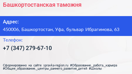 Башкортостанская таможня по адресу 450006, Башкортостан, Уфа, бульвар Ибрагимова, 63 в дальнейшем Организация, размещена в следующих категориях: