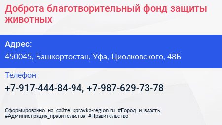 Доброта, благотворительный фонд защиты животных по адресу 450045, Башкортостан, Уфа, Циолковского, 48Б в дальнейшем Организация, размещена в следующих категориях: