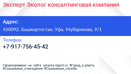 Эксперт-Эколог, консалтинговая компания по адресу 450092, Башкортостан, Уфа, Мубарякова, 9/1 в дальнейшем Организация, размещена в следующих категориях: