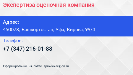 Экспертиза, оценочная компания по адресу 450078, Башкортостан, Уфа, Кирова, 99/3 в дальнейшем Организация, размещена в следующих категориях: