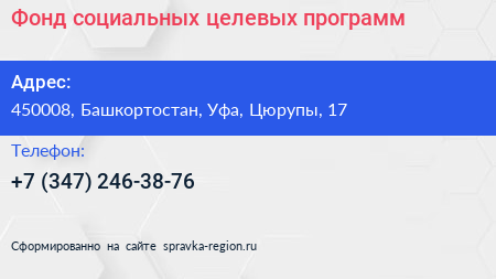 Фонд социальных целевых программ по адресу 450008, Башкортостан, Уфа, Цюрупы, 17 в дальнейшем Организация, размещена в следующих категориях: