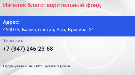 Изгелек, благотворительный фонд по адресу 450076, Башкортостан, Уфа, Красина, 21 в дальнейшем Организация, размещена в следующих категориях: