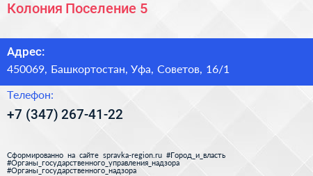 Колония-Поселение №5 по адресу 450069, Башкортостан, Уфа, Советов, 16/1 в дальнейшем Организация, размещена в следующих категориях: