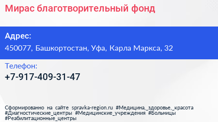 Мирас, благотворительный фонд по адресу 450077, Башкортостан, Уфа, Карла Маркса, 32 в дальнейшем Организация, размещена в следующих категориях: