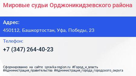 Мировые судьи Орджоникидзевского района по адресу 450112, Башкортостан, Уфа, Победы, 23 в дальнейшем Организация, размещена в следующих категориях: