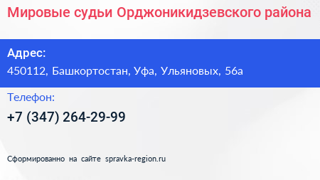Мировые судьи Орджоникидзевского района по адресу 450112, Башкортостан, Уфа, Ульяновых, 56а в дальнейшем Организация, размещена в следующих категориях: