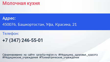 Молочная кухня по адресу 450076, Башкортостан, Уфа, Красина, 21 в дальнейшем Организация, размещена в следующих категориях: