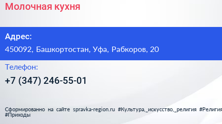 Молочная кухня по адресу 450092, Башкортостан, Уфа, Рабкоров, 20 в дальнейшем Организация, размещена в следующих категориях: