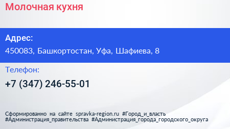 Молочная кухня по адресу 450083, Башкортостан, Уфа, Шафиева, 8 в дальнейшем Организация, размещена в следующих категориях: