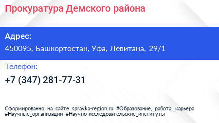 Прокуратура Демского района по адресу 450095, Башкортостан, Уфа, Левитана, 29/1 в дальнейшем Организация, размещена в следующих категориях: