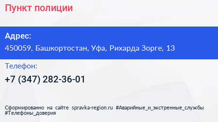 Пункт полиции по адресу 450059, Башкортостан, Уфа, Рихарда Зорге, 13 в дальнейшем Организация, размещена в следующих категориях: