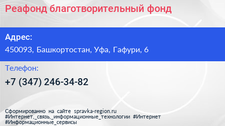 Реафонд, благотворительный фонд по адресу 450093, Башкортостан, Уфа, Гафури, 6 в дальнейшем Организация, размещена в следующих категориях: