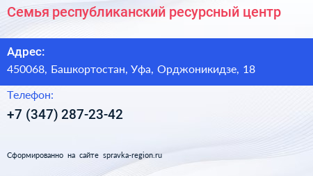Семья, республиканский ресурсный центр по адресу 450068, Башкортостан, Уфа, Орджоникидзе, 18 в дальнейшем Организация, размещена в следующих категориях: