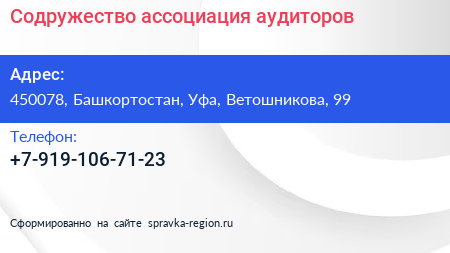 Содружество, ассоциация аудиторов по адресу 450078, Башкортостан, Уфа, Ветошникова, 99 в дальнейшем Организация, размещена в следующих категориях: