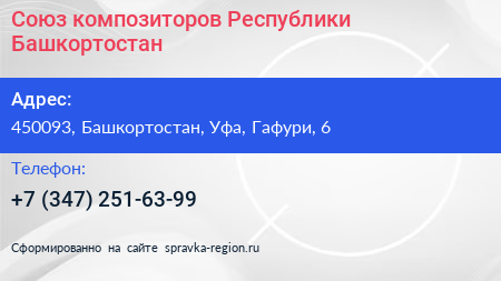 Союз композиторов Республики Башкортостан по адресу 450093, Башкортостан, Уфа, Гафури, 6 в дальнейшем Организация, размещена в следующих категориях: