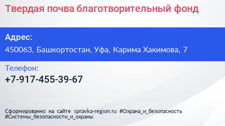 Твердая почва, благотворительный фонд по адресу 450063, Башкортостан, Уфа, Карима Хакимова, 7 в дальнейшем Организация, размещена в следующих категориях: