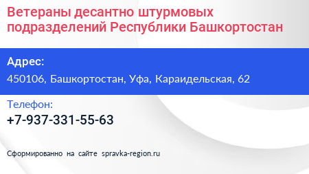 Ветераны десантно-штурмовых подразделений Республики Башкортостан по адресу 450106, Башкортостан, Уфа, Караидельская, 62 в дальнейшем Организация, размещена в следующих категориях:
