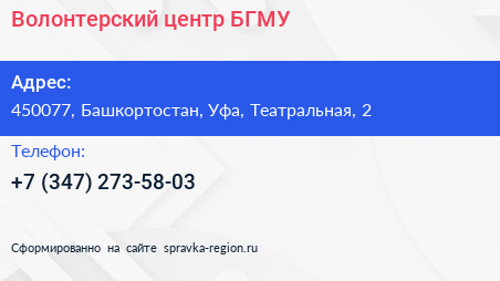 Волонтерский центр, БГМУ по адресу 450077, Башкортостан, Уфа, Театральная, 2 в дальнейшем Организация, размещена в следующих категориях: