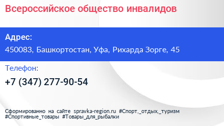 Всероссийское общество инвалидов по адресу 450083, Башкортостан, Уфа, Рихарда Зорге, 45 в дальнейшем Организация, размещена в следующих категориях: