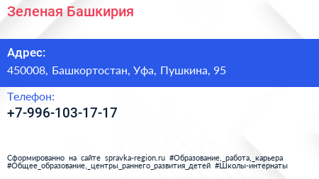 Зеленая Башкирия по адресу 450008, Башкортостан, Уфа, Пушкина, 95 в дальнейшем Организация, размещена в следующих категориях: