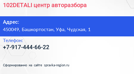 102DETALI, центр авторазбора по адресу 450049, Башкортостан, Уфа, Чудская, 1 в дальнейшем Организация, размещена в следующих категориях: