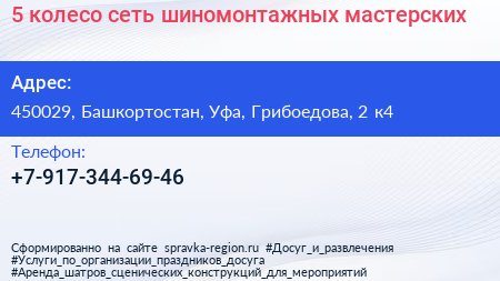 5 колесо, сеть шиномонтажных мастерских по адресу 450029, Башкортостан, Уфа, Грибоедова, 2 к4 в дальнейшем Организация, размещена в следующих категориях: