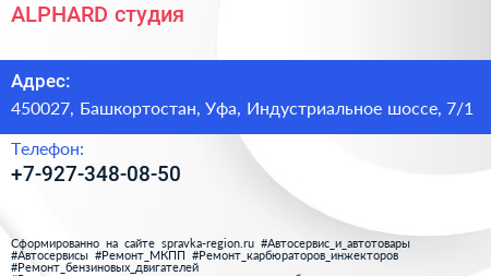 ALPHARD, студия по адресу 450027, Башкортостан, Уфа, Индустриальное шоссе, 7/1 в дальнейшем Организация, размещена в следующих категориях: