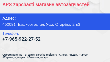 APS zapchasti, магазин автозапчастей по адресу 450081, Башкортостан, Уфа, Огарёва, 2 к3 в дальнейшем Организация, размещена в следующих категориях:
