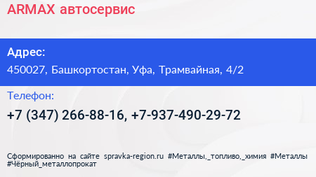 ARMAX, автосервис по адресу 450027, Башкортостан, Уфа, Трамвайная, 4/2 в дальнейшем Организация, размещена в следующих категориях: