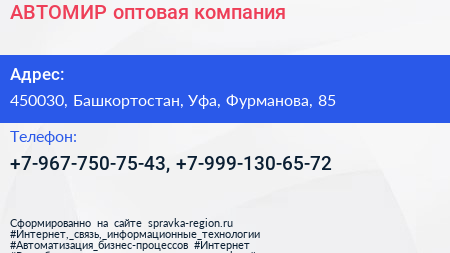 АВТОМИР, оптовая компания по адресу 450030, Башкортостан, Уфа, Фурманова, 85 в дальнейшем Организация, размещена в следующих категориях: