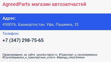AgreedParts, магазин автозапчастей по адресу 450076, Башкортостан, Уфа, Пушкина, 31 в дальнейшем Организация, размещена в следующих категориях: