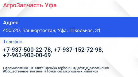АгроЗапчасть-Уфа по адресу 450520, Башкортостан, Уфа, Школьная, 31 в дальнейшем Организация, размещена в следующих категориях:
