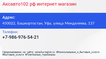 Аксавто102.рф, интернет-магазин по адресу 450022, Башкортостан, Уфа, улица Менделеева, 137 в дальнейшем Организация, размещена в следующих категориях:
