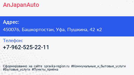 AnJapanAuto по адресу 450076, Башкортостан, Уфа, Пушкина, 42 к2 в дальнейшем Организация, размещена в следующих категориях: