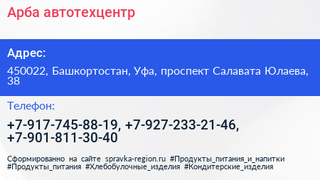 Арба, автотехцентр по адресу 450022, Башкортостан, Уфа, проспект Салавата Юлаева, 38 в дальнейшем Организация, размещена в следующих категориях: