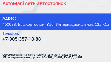 AutoMani, сеть автостоянок по адресу 450038, Башкортостан, Уфа, Интернациональная, 135 к1а в дальнейшем Организация, размещена в следующих категориях: