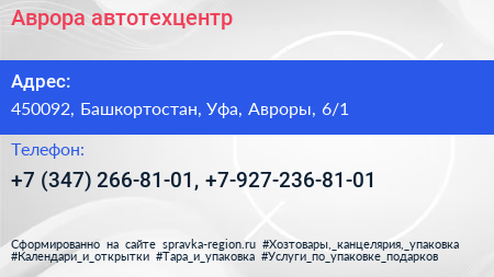 Аврора, автотехцентр по адресу 450092, Башкортостан, Уфа, Авроры, 6/1 в дальнейшем Организация, размещена в следующих категориях: