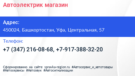 Автоэлектрик, магазин по адресу 450024, Башкортостан, Уфа, Центральная, 57 в дальнейшем Организация, размещена в следующих категориях: